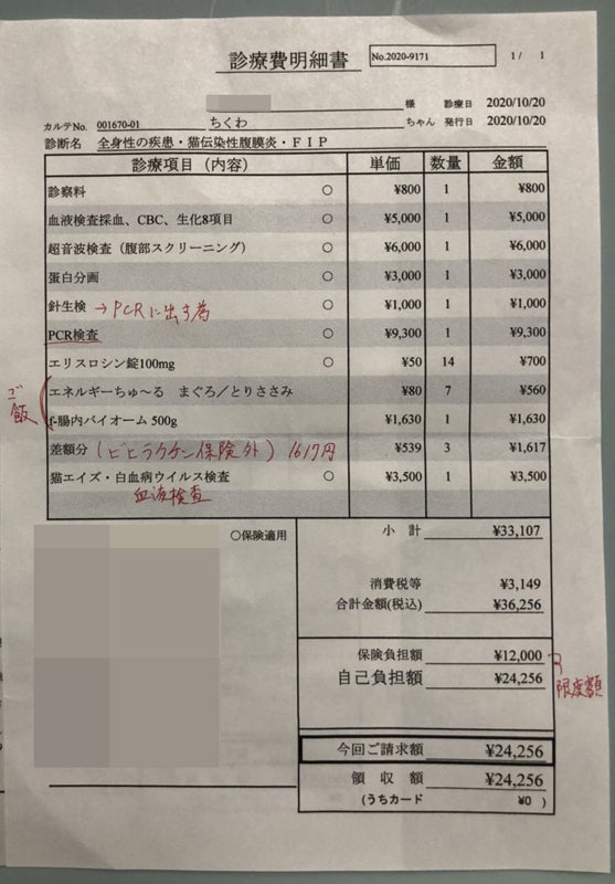また、ちくわはFIPの中でもドライタイプで、新薬の量と値段は1.5倍に跳ね上がります。飼い主なのであればそれくらい責任持って前々から準備するべきだったのではないか、と思う方もいるかもしれませんが、ちくわを迎え入れてまさか5ヶ月程でFIPという不治の病を発症するとは思っていませんでした…。しかし、今回このFIPの治療費は、私達の想像を遥かに超える金額でした…。
