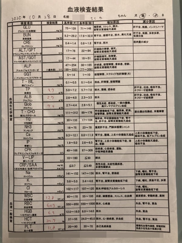 10/20の血液検査の結果です。貧血気味で、蛋白質の中でも、グロブリンの数値が高めです。