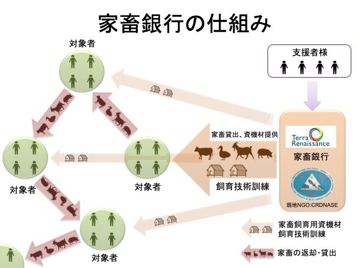牛、ヤギ、豚、鶏、アヒルなどの家畜を貸し出し、繁殖させて、返却してもらうことで、返却された家畜をまた別の世帯へ貸し出すことができ、どんどん拡大させていくことができます。今回の支援で実施することは、以下の4つです。