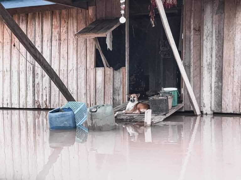 ■写真:バッタンバン州カムリエン郡は、膝上まで浸水し、高床式でない家のなかまで浸水