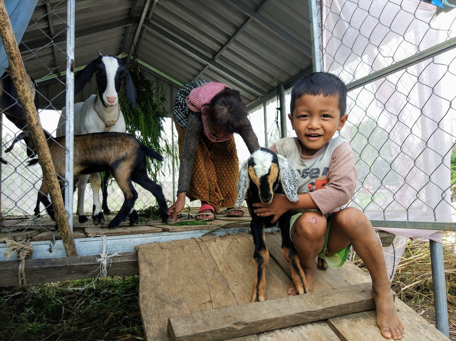 ■写真:生まれた子ヤギを可愛がる家畜銀行の対象世帯の男の子