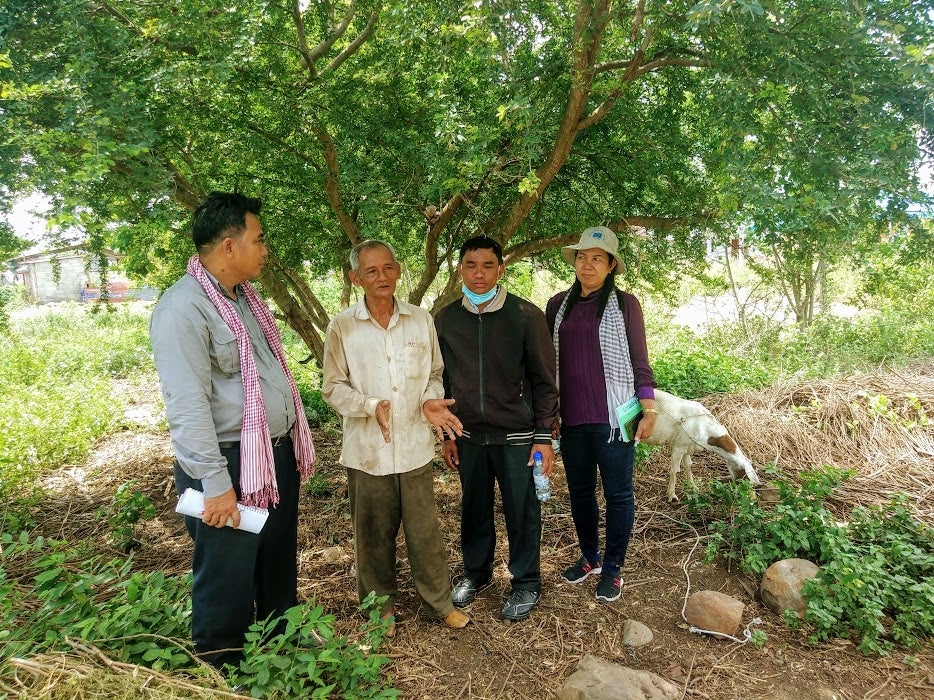 ■写真:2020年7月にカンボジア政府のバッタンバン州農林水産局のモニ副局長らがソーンさんの家を視察した時の様子(写真左から2人目、白いシャツの男性がソーンさん)