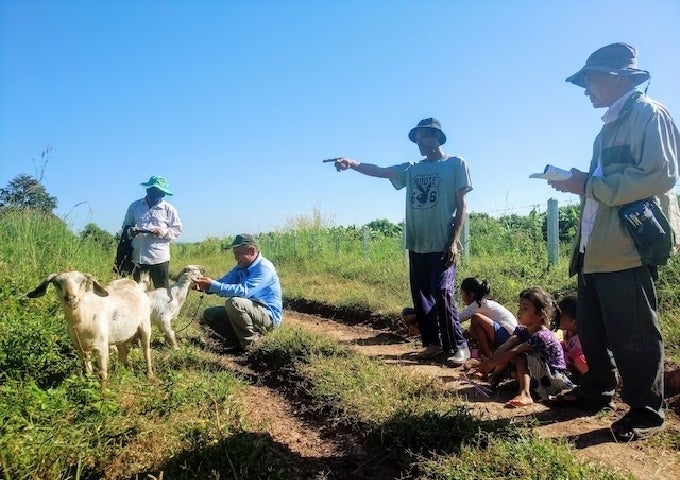 ↑ヤギの餌をバイクで採ってきた地雷被害者(左)と感染症の確認をする農業専門家のサヴォン氏(右)