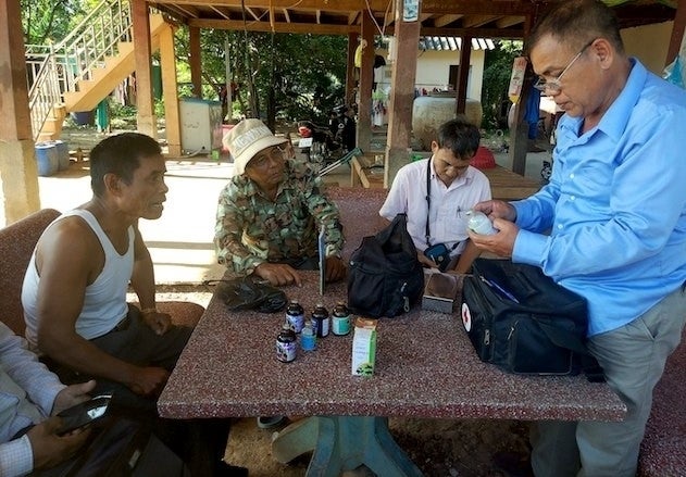 ↑獣医(写真左の白いシャツの男性)の薬が適切かどうかを確認する農業専門家たち