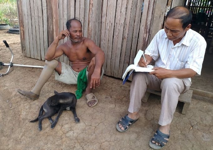 カンボジアの北西部、バッタンバン州カムリエン郡にはイェン・ハンさん(50歳)という、2017年から支援している地雷被害者がいます。今でも、2017年の事業開始前にインタビューした時のことをよく覚えています。家まで行く道が悪く、車では途中までしか行けないためバイクで迎えに来てくれましたが、結局そこから歩いて家に行きました。