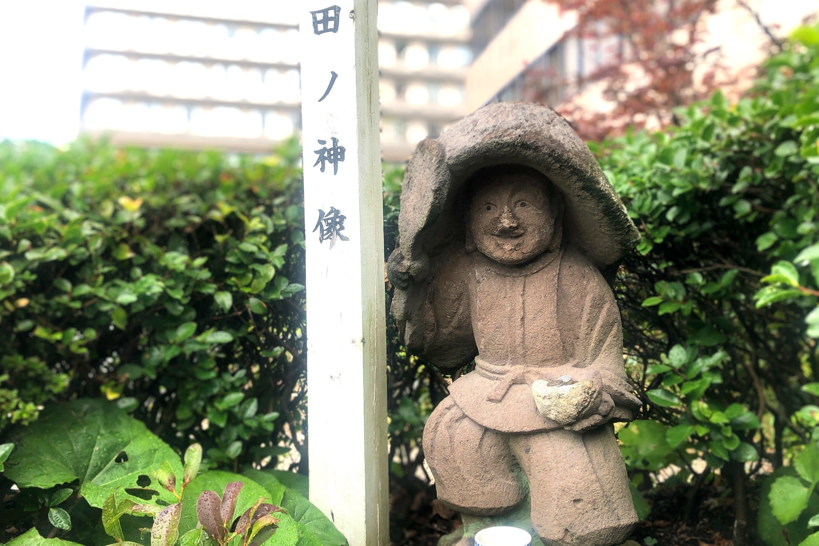 実はこの写真、私たちが仕事をしているビルの1階の写真です。日本一になった記念パネルが壁一面に貼られていますが、玄関のすぐ横には、こんな「田ノ神像」も祀っているんです。