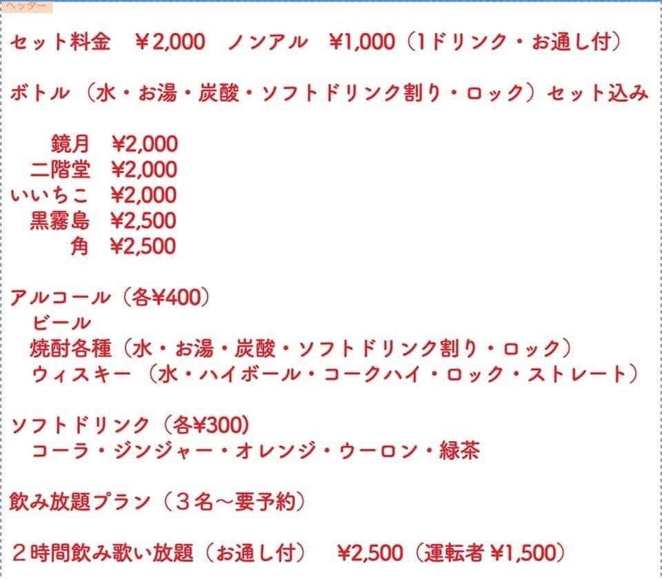①年金生活のお客様でも、金銭面の心配をせず何度でも飲みに来て頂けるよう最低限の値段でご提供させて頂きます。(現時点では以下の値段で考えております)