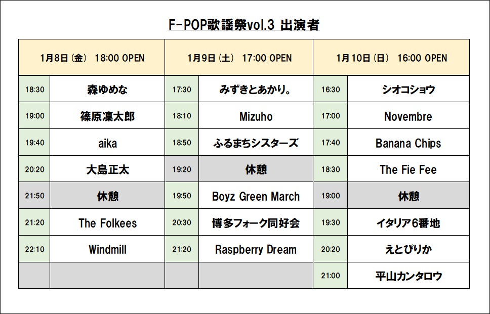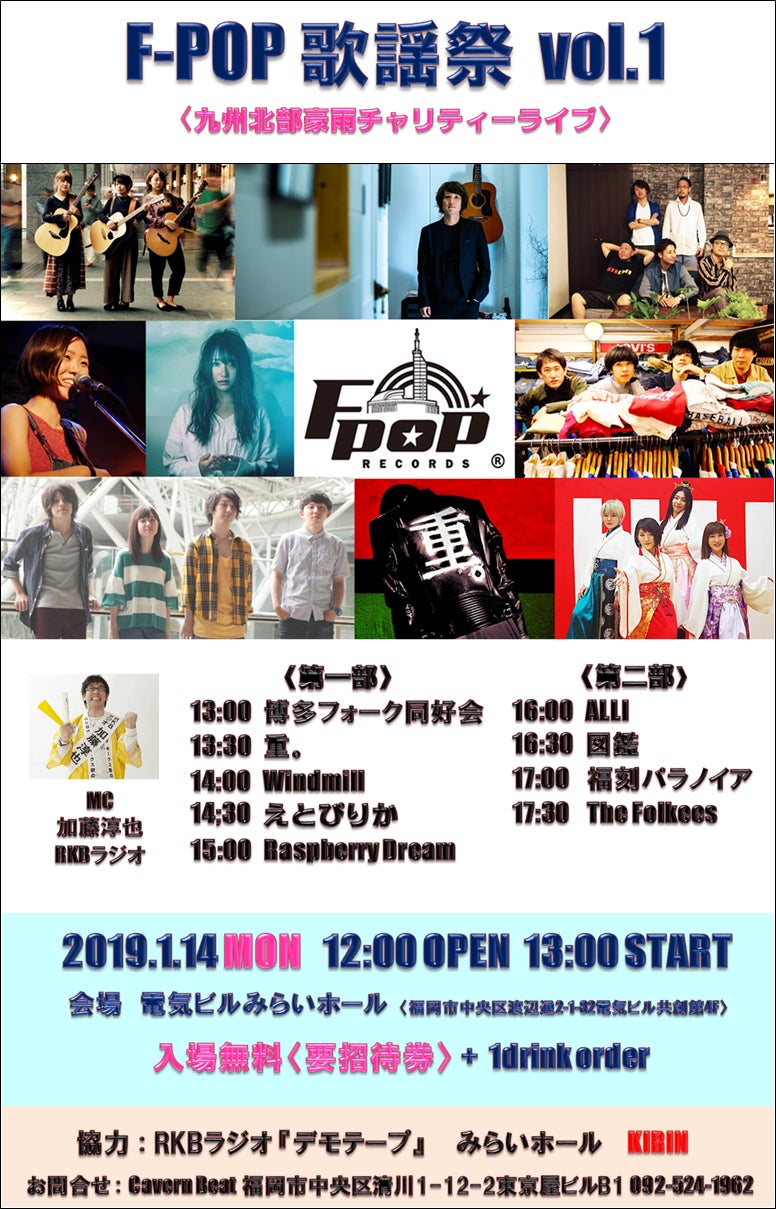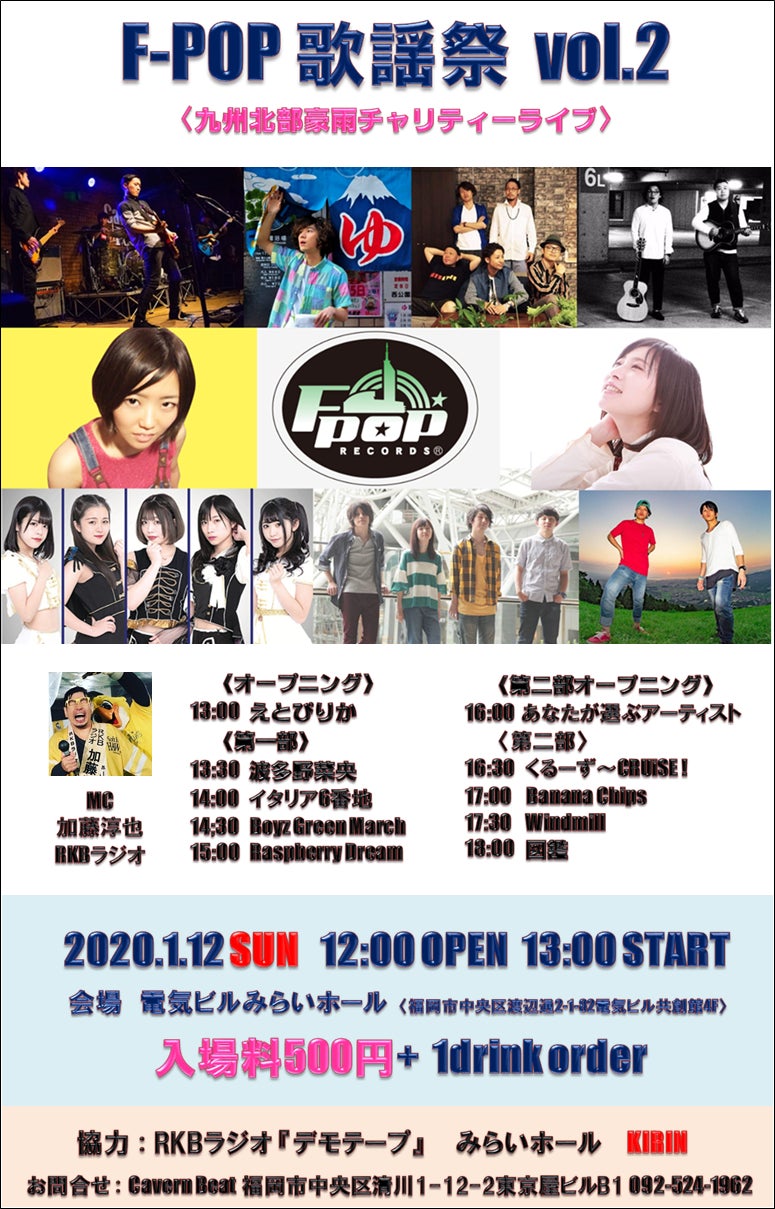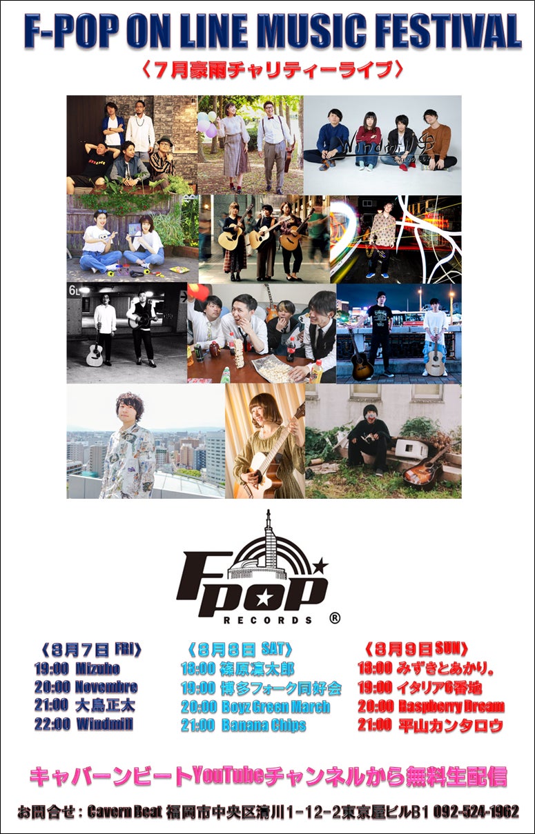 福岡にはまだ世には出てませんが、頑張っている才能ミュージシャンが本当にたくさんいます。福岡の皆様そして全国の音楽が好きな方にキャバーンビートからの生配信ライブであるF-POP歌謡祭vol.3を2021年1月8日から10日までま3日間お届けして福岡でがんばっている才能をたくさん紹介したいですし新しいF-POPという福岡の音楽の時代をアーティストやファンの皆様と協力して作っていきたいと思います。