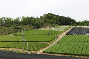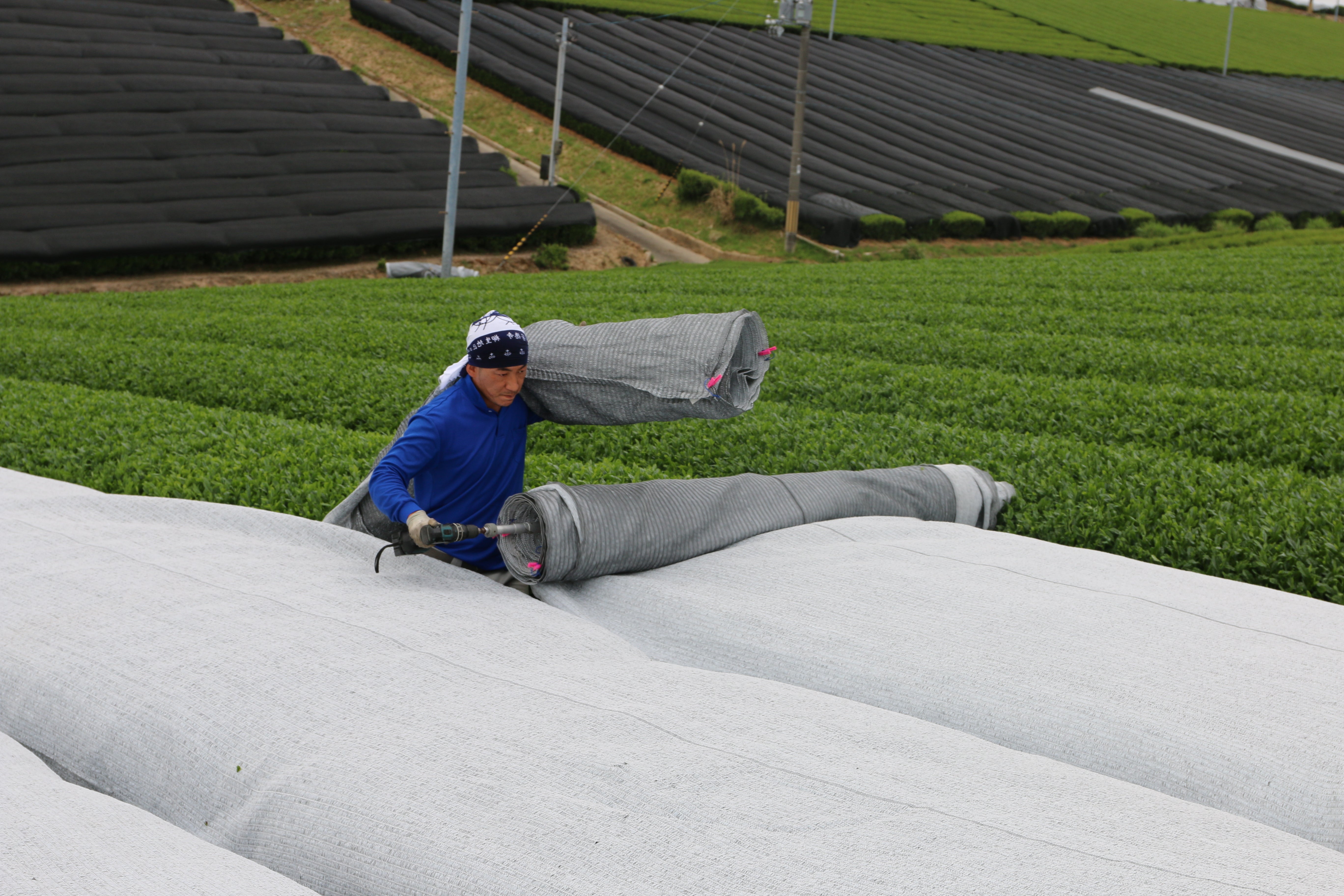 お茶の産地に行くと見られる、茶木に黒いネット等をかぶせて光を遮る工程です。