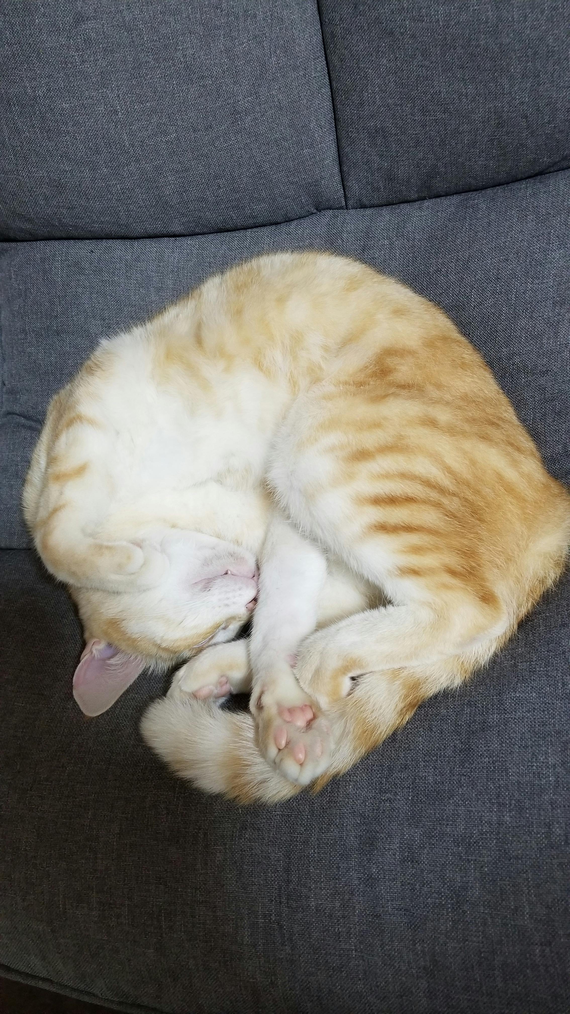 寒くて体を丸めています(´・ε・̥ˋ๑)猫は寒がりですもんね!上になにか掛けてあげます(*^^*)丸くなったタロウも可愛いwww(˙ᗜ˙)