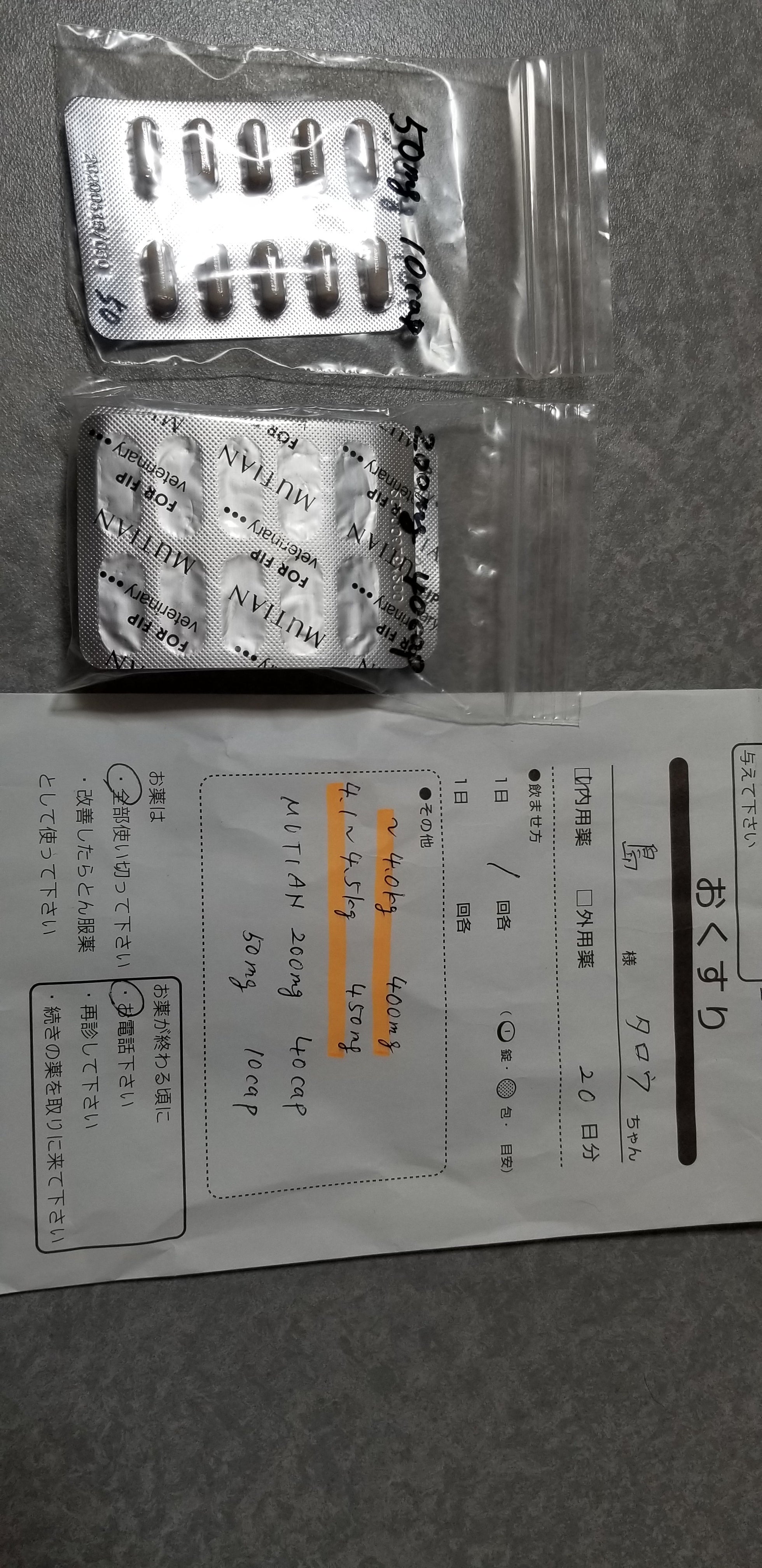 というふうに体重によって必要な投薬量も変わっていきます。このムテイアンの50mgの価格は、1200円になっており、現在体重が、3.8kgのタロウが現在飲んでいる投与量が、400mgですので、1日9600円のお金が必要になっています。(1200円×8=9600円)、今後は薬が効いて食欲も増える事で、体重も増えて行くと思います。その分もふくめると、84日間の投薬にかかるお金は100万円程かかります。さらに、定期的に実施する検査費用など、タロウの治療に必要な医療費用に充てさせて頂きます。