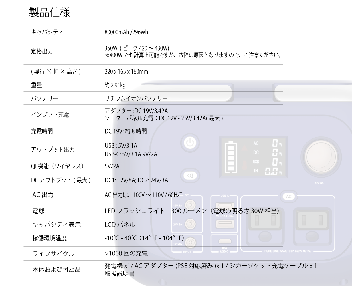 女性でも片手で簡単に持ち運べる軽量コンパクトなボディーで400Wまで使用可能、災害時の非常用電源としての活用はもちろんのこと、キャンプやレジャーをはじめ、ガーデニングやベランダ作業でも大活躍です!