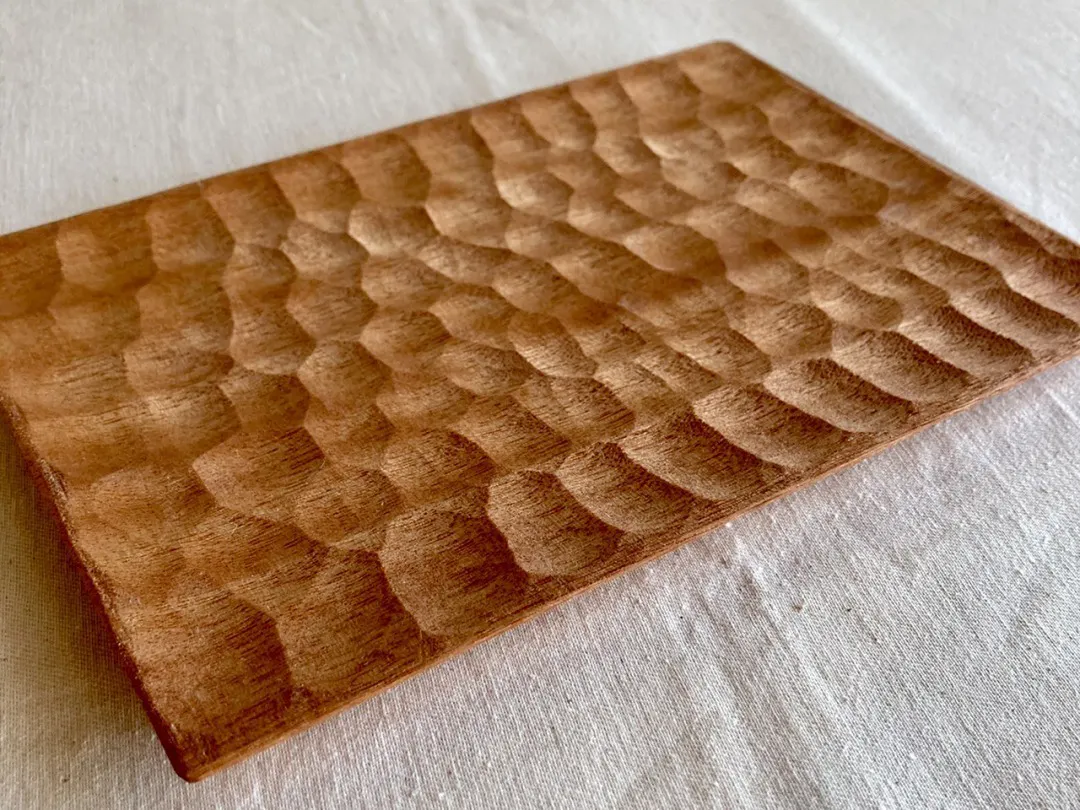 この模様は、ひとつひとつ木をコンコン彫って作っています。