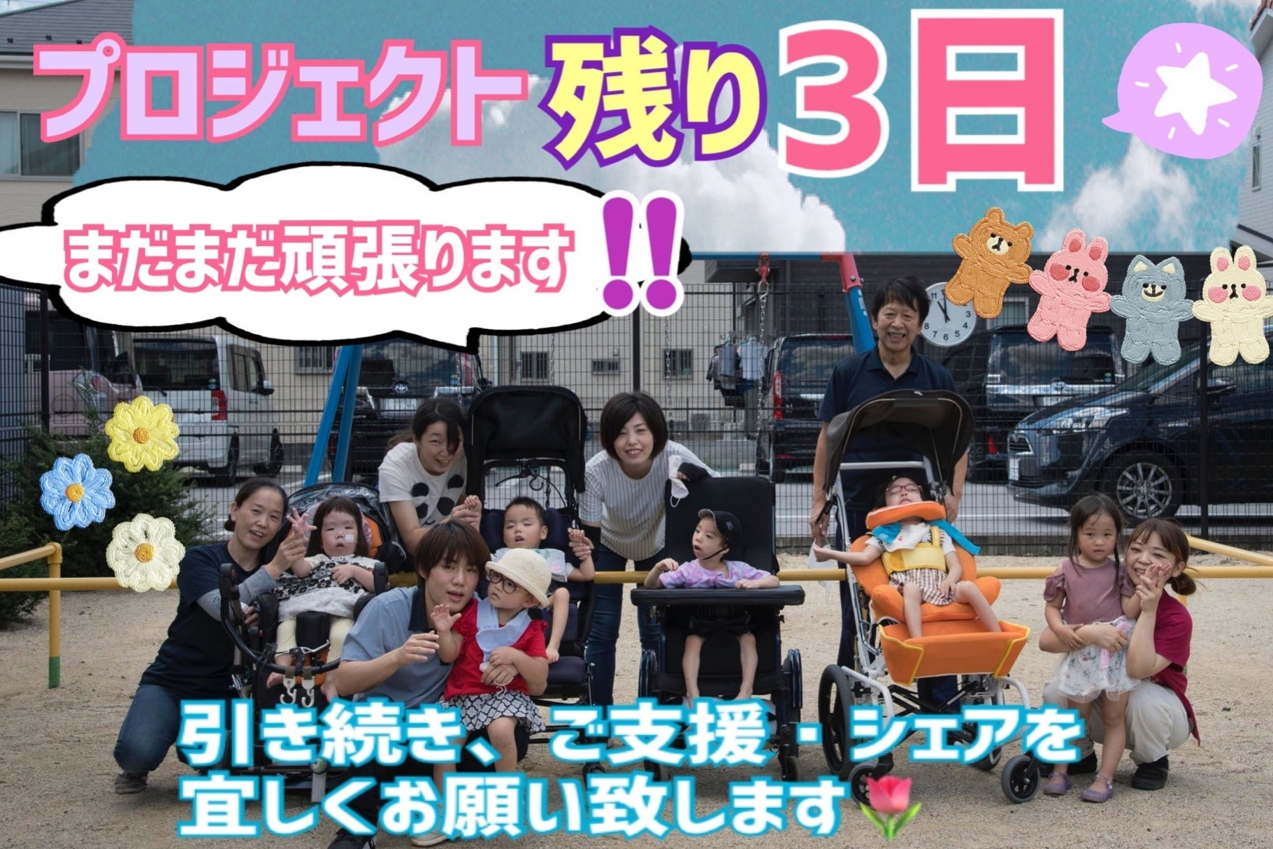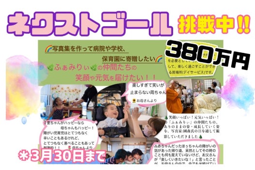 2021/03/27 12:39こんにちは。皆様のあたたかいご支援とシェア等のご協力のお陰で、現在の支援総額が345万円、支援者数372人に到達する事が出来ました。本当にありがとうございます。プロジェクト開始当初は、目標に達成できるのかどうか、とても不安でした。ですが、色々な人に私たちの想いなどをお伝えする事で皆様からのあたたかいご支援を頂いたり、応援のメッセージを頂いて、胸が熱くなったり、「もっともっと頑張ろう!」という原動力となりました。そして、当初の目標金額300万円を達成することが出来、今ネクストゴールに挑戦中です。ネクストゴールに到達できれば、ふぁみりぃの写真集が増刷でき、沢山の人の目に留まり、ふぁみりぃの仲間たちの笑顔や元気を伝えることが出来ます。他にも、ふぁみりぃの仲間たちの存在を知ってもらいたい。障がいがあっても、毎日元気いっぱいに成長していく姿に、私たちスタッフが沢山の力をもらっているということを伝えたい。また、障がいの有無に関わらず、誰もが社会の一人として認められて存在し、地域の中で生きいきと生きていける社会を目指したい。そして、障がいがあったり、医療的ケアが必要な我が子を抱えて、悩んでいたり、生きることに前を向けずにいる人の、道しるべになれればと思っています。色んな想いがつまった写真集を沢山の人に届け、見てもらい、感じてもらいたい。ネクストゴール達成まで残り35万円。そして本日で、プロジェクト終了まで残り3日。より想いが伝わる写真集となる様に、そして一人でも多く、私たちのプロジェクトを立ち上げた想いや目標をお伝えし、ご支援を頂けるように、、まだまだ、私たちは動き続け頑張ります!!皆様にも、重ねてにはなりますが、引き続きのご支援とご協力を、どうぞ宜しくお願い致します。---------------------------------------------------------topの写真は、去年、写真家國森さんに撮って頂いたもので、ふぁみりぃのかわいい仲間たちとスタッフで公園に行った写真です♪ もっと見る