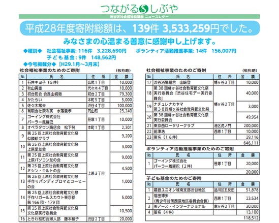 寄付していただいた全員を対象に、「渋谷区社会福祉協議会HP」と「社協だより」に名前が掲載されることになりました