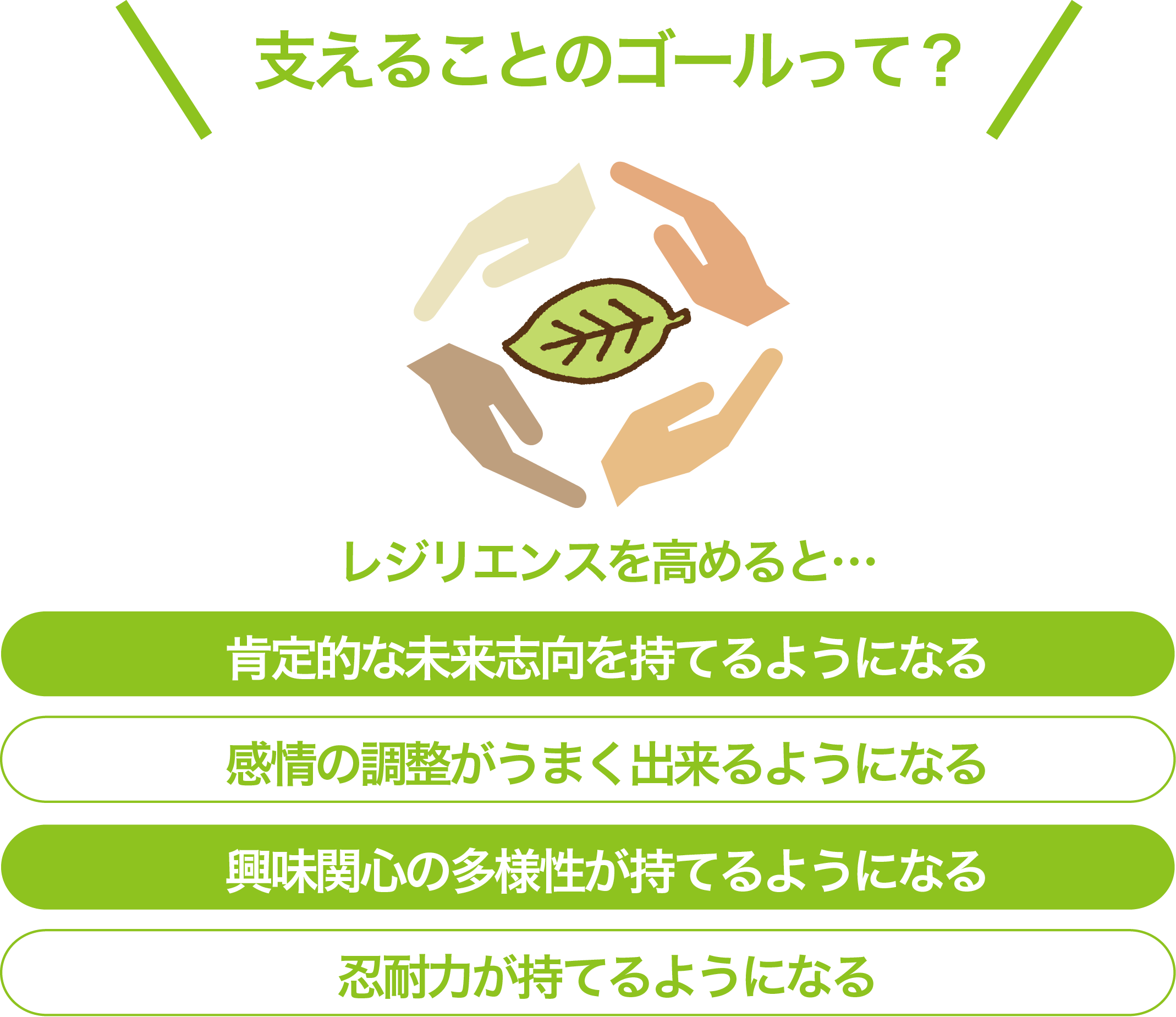 心の傷に苦しんでいる子どもたちに寄り添うことで、「ひとりじゃない」という実感を持ってもらい、レジリエンス(精神的な弾力性や回復力)を高めることを目標をしています。レジリエンスを高めると、肯定的な未来志向、感情の調整がうまくできるようになるなど、子どもの成長の力となります。