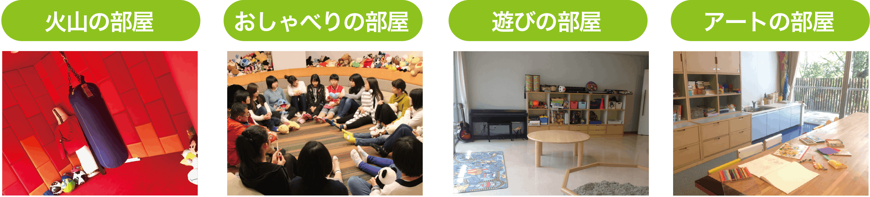 子どもたちが抱いている様々な気持ちやエネルギーを表現できるよう、お互いの顔を見ながら語り、聴くことのできる「おしゃべりの部屋」、自分や相手を傷つけずに大きなエネルギーを表現できる「火山の部屋」など様々な部屋があります。