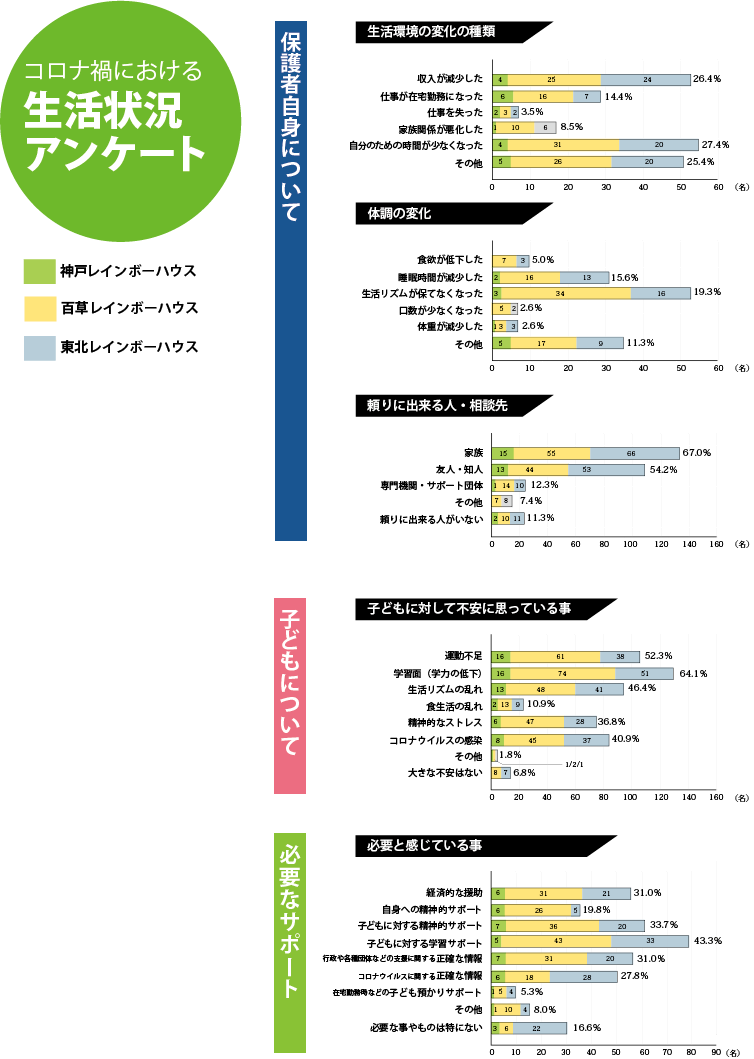 レインボーハウスでは本年6月に全国のプログラム参加者や対象の方々へコロナ禍における生活状況の変化について アンケートを行いました。レインボーハウスの利用の有無に関わらず、多くの声を頂きました。アンケートでは精神的なサポートが必要と回答している方が多く、「不安な気持ちを子には言わないようにしているが、吐露する相手(夫)もいなく、1人で抱えることが多くなった」といった不安を表現することの出来ない切実な状況などが描かれていました。 ※以下はアンケート集計の一部です。