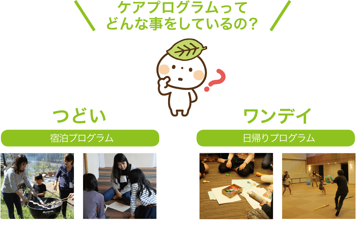 ●つどい:2泊3日または1泊2日の泊りがけプログラムです。テラスで野外調理など遊びを通して交流を深め、お話の時間ではなくなった家族について話したり(パスもできます)学校での悩みごと、将来の夢などを分かち合います。