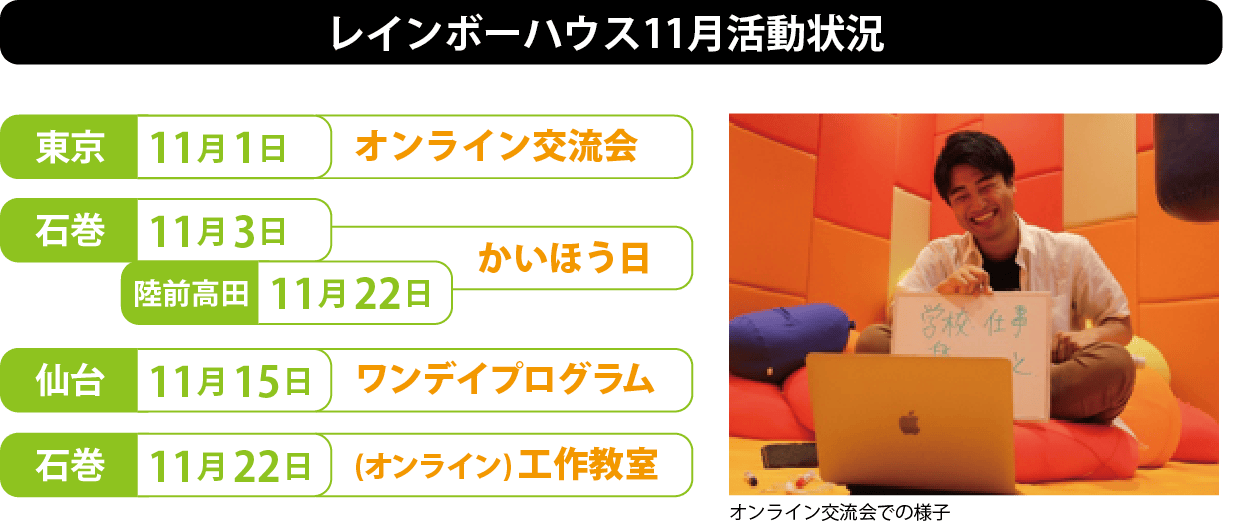 今年2月に開催した「仙台ワンデイプログラム」以降、プログラムの開催を一時見合わせていました。その間、プログラム再開に向けた感染対策の整理を進め、7月に「仙台かいほう日」という形でプログラムを再開し始めました。普段のワンデイプログラムと比べ規模を縮小(短時間、少人数)した形での開催ではありましたが、数か月ぶりにレインボーハウスに子どもたちの元気な声が戻ってきました。 その後、9月にも同様の形でプログラムを開催、10月からは参加人数の制限等を設けながらも、ほぼ通常通りの「仙台ワンデイプログラム」が再開となりました。 今後も感染者数の推移や地域の状況を考慮しながら、定期的にプログラムを開催していければと考えています。