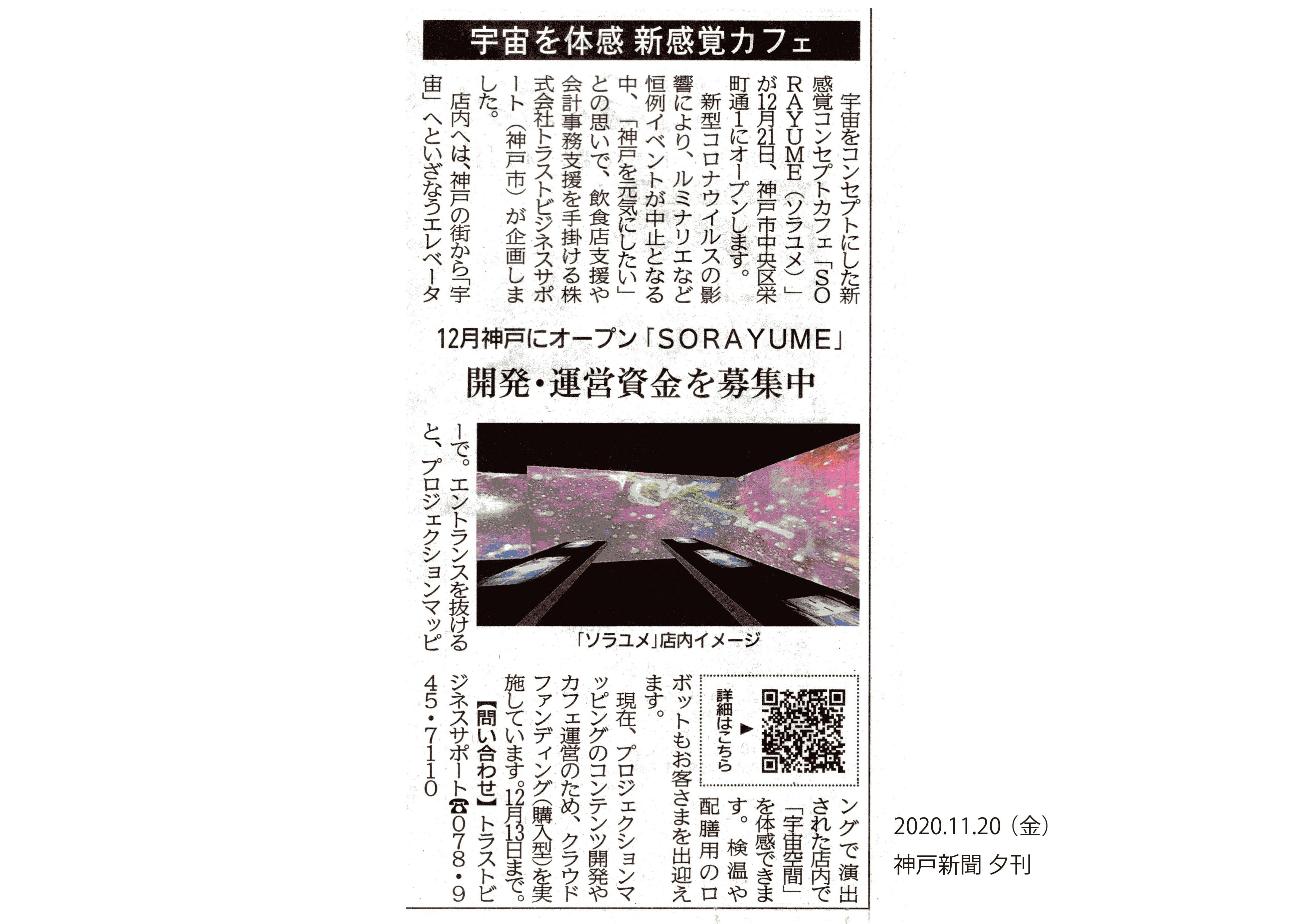 本日、「SORAYUME」プロジェクトが神戸新聞に掲載されました!(11月20日夕刊誌面)
