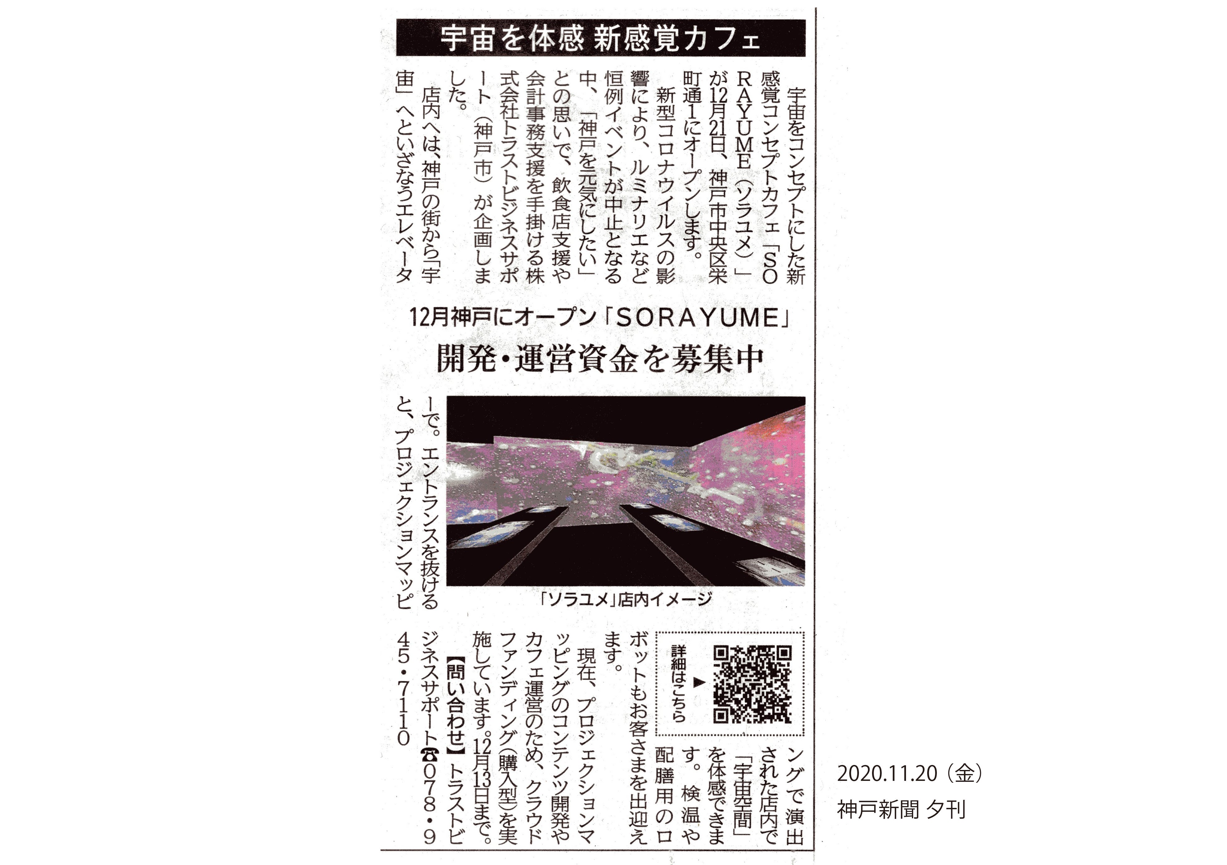 本日、「SORAYUME」プロジェクトが神戸新聞に掲載されました!(11月20日夕刊誌面)地元の新聞社に取り上げていただき、大変ありがたく思います。私たちの目指すコンセプトを凝縮してとてもわかりやすくまとめていただいています。皆さまのご支援が私たちの今後の活動、プロジェクト挑戦への大きな励みになります!神戸新聞を見た!という方がいらっしゃればぜひ応援をお願いいたします。