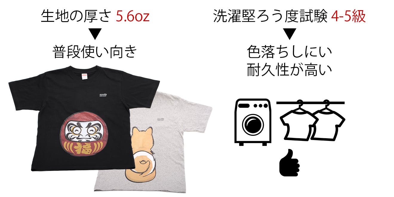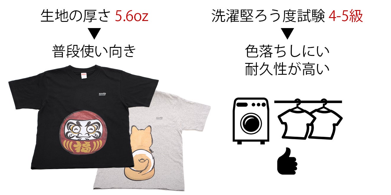A.Tシャツの生地は5.6oz(オンス)を採用しています。これは普段使いにおいて全く問題ない、むしろ積極的に着用いただける厚手の生地となっています。プリントの耐久性も高い基準を満たしておりますので遠慮なくお洗濯してください。