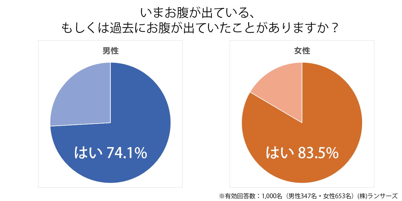 アンケートの結果、「いまお腹が出ている、もしくは過去にお腹が出ていたことがある」と答えた方が男性257名(74.1%)・女性545名(83.5%)となりました。