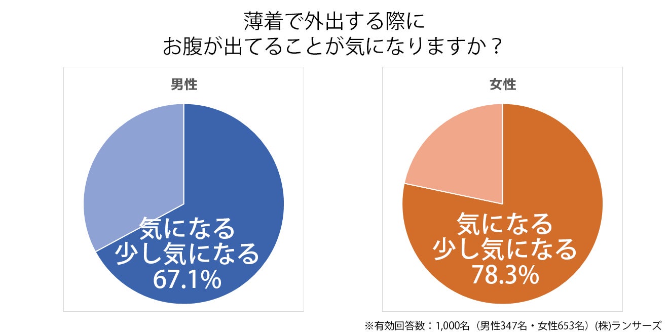 他にも「お腹が出ている、もしくは過去に経験がある人」を対象に「薄着で外出する際にお腹が出てることが気になりますか?」という質問に対して「気になる・少し気になる」と回答した方が男性233名(67.1%)・女性511名(78.3%)となりました。