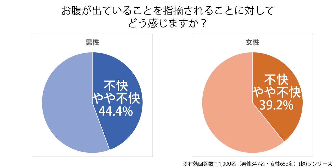 また「お腹が出ていることを指摘されることに対してどう感じますか?」という質問に対しては「やや不快・不快」と回答した方が男性154名(44.4%)・女性256名(39.2%)となりました。