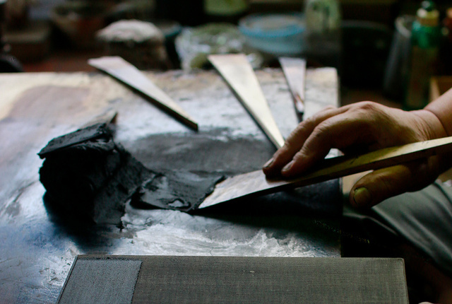 ▼輪島塗の職人がヘラを使用する様子