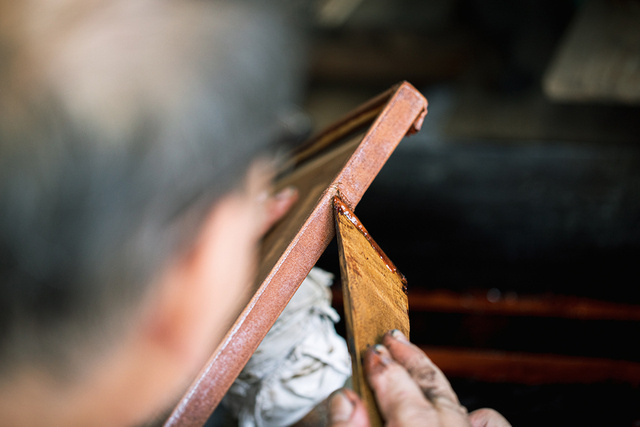 生漆(きうるし)を塗って、布で拭いて、乾かすという作業をすることで、木の内部まで漆が染み込むので、丈夫になり、水や油分を弾きます。