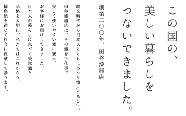 1818年創業の輪島塗の製造販売メーカー田谷漆器店。輪島塗の技法を忠実に守りながらも、新しい漆器の可能性を求めて様々なことに挑戦。建築内装への漆塗装や、海外マーケットに向けて現地のライフスタイルにあった商品の展開を行う。日本の一般顧客向けには、飽きのこない伝統的なオーソドックスな商品を作る。現在は、8代目田谷勤、9代目田谷昭宏、10代目田谷昂大の3世代が同時に働いており、その他10名の職人や従業員とともに、輪島の地で輪島塗製作を行う。