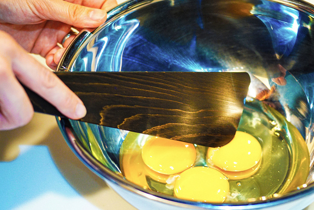 輪島塗の職人が1日に100を超える器の下地の作業に使っているヘラを料理用のヘラに応用。古来より職人が作業をしやすいように角度や薄さを考えて作りあげられたこだわりのフォルムは、料理の際にもその特性が十分に発揮され、使い勝手がとてもいいフォルムになっています。