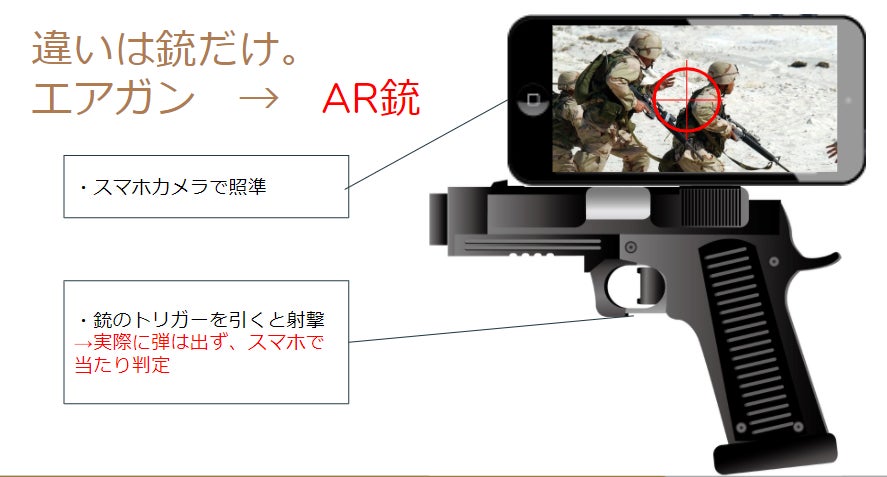 このとき、エアガンとは違い実際の弾は出ず、スマートフォンの上で当たったかどうか判定されます。