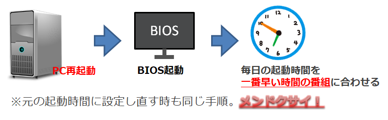 PC再起動して、BIOSから時間変更して、また後で元の起動時間に戻して、、メンドクサイ!