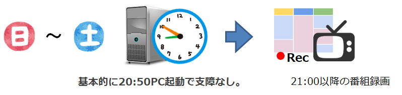 私の場合、基本的に21:00以降の番組(ドラマ、バラエティ、深夜アニメ)しか見ないので、通常は毎日20:50に起動しておけば録画に支障は出ない。