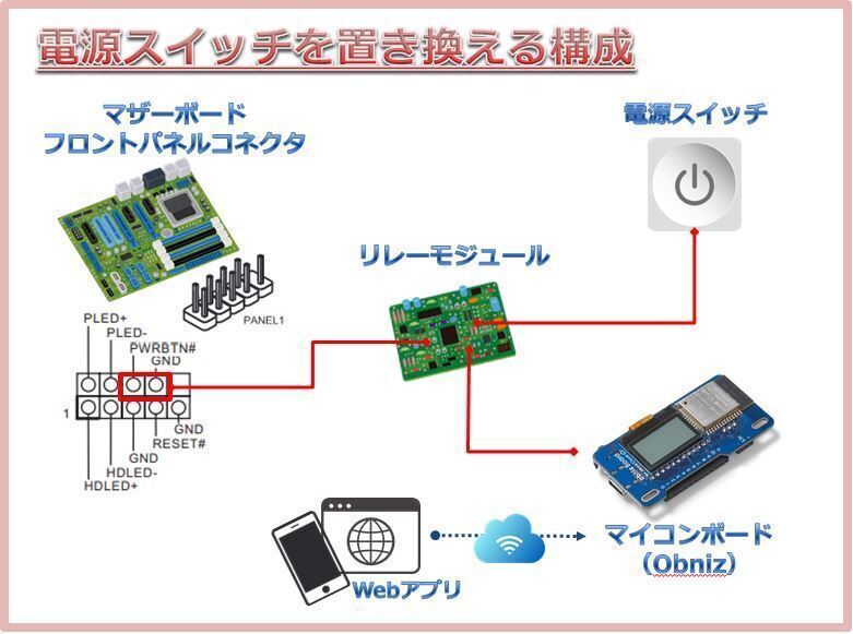 自作PCのマザーボードのフロントパネルコネクタ(PWRBTN#)へ、マイコンボード(Obniz)を接続して利用します。クラウドに接続したマイコンボードからリレーを遠隔操作し、PWRBTN#をショートさせて電源をONにする仕組みです。