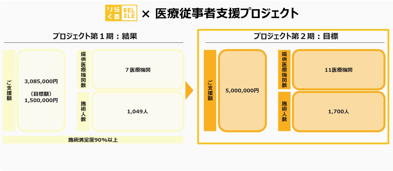 プロジェクト第1期では合計 3,085,000 円のご支援をいただき、11 月 16 日時点で、7 つの医療機関、計 1,049 人の医療従事者の皆様へ当社のリラクゼーションをお届けすることが出来ました。ご支援並びに、本プロジェクトをご覧いただきました皆様へ心より御礼申し上げます。今回第2期として新たに5,000,000円の目標金額を掲げ、更に 11 の医療機関様への施術を予定しております。