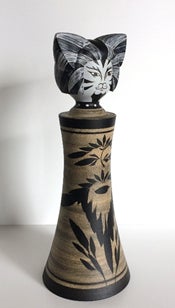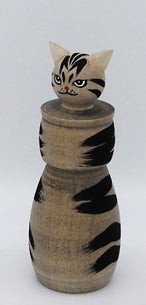 キャッツこけしをよくよく見ていて気付いたのは、伝統こけしをリスペクトしながらオリジナルを追及して造ったところが随所にあるということです。この写真のキャッツこけしのモデルとなった猫の名前はマンカストラップです。