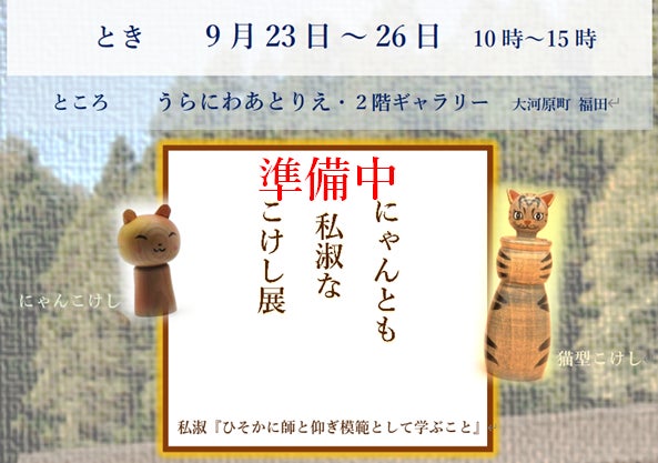 9月23日~26日に「にゃんこけし」の産みの親である阿部浩秋工人が運営しているうらにわあとりえにおいて開催します。パネル展示とできればこけし現物展示&販売をしたいと考えており準備しています。場所は宮城県大河原市で、車でないと来れないところにあり、遠方の方ごめんなさい。