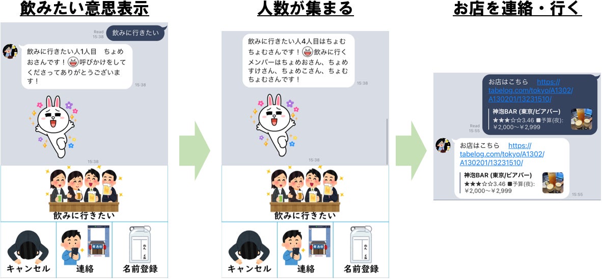 続けて「今日のお店はこちらです(URL)」と投稿すると、飲み会参加者にメッセージがくる。