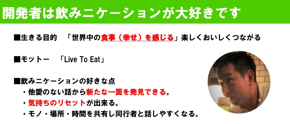 今回のサービスは、私の好きな「食事」×課題に感じている「コミュニケーション」で、「誰と」のコミュニケーションの部分にフォーカスをして誰かと飲んで話すことで、食事の楽しさを感じる機会を増やし、結果として会社のコミュニケーションの活性化ができるなら、こんないいことはない!と考えて作りました。