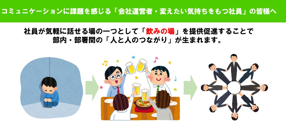 社内の数あるコミュニケーションの中で、お堅くならずに、まずは「社員の人が気軽に話す」というところから始めて、社員に飲みニケーションの機会を作ってみましょう!