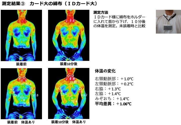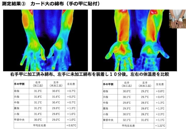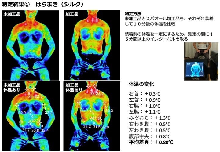 いずれの測定でもスパオール装着により体温が上昇することを確認しました。スパオールを加工する素材に関係なく、スパオール自体に血流促進効果があることが認められました。