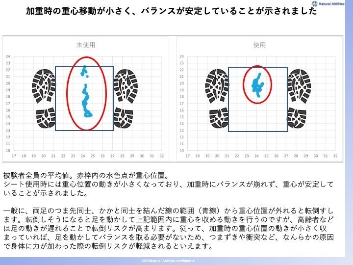 一見ただのシートなのですが、使ってみると確かにバランスが安定します。試しに押したり引いたりといったバランステストをしてみると、驚くほど安定しているのが実感できます。万一の際の転倒リスクが軽減していることは間違いないですね。重心が安定するので歩行も楽になりますし、疲労感も少なくなると思います。特に高齢者や妊婦など、運動量が少なくなりがちな方にお使いいただき、適度な運動を続けていただけたらと思います。