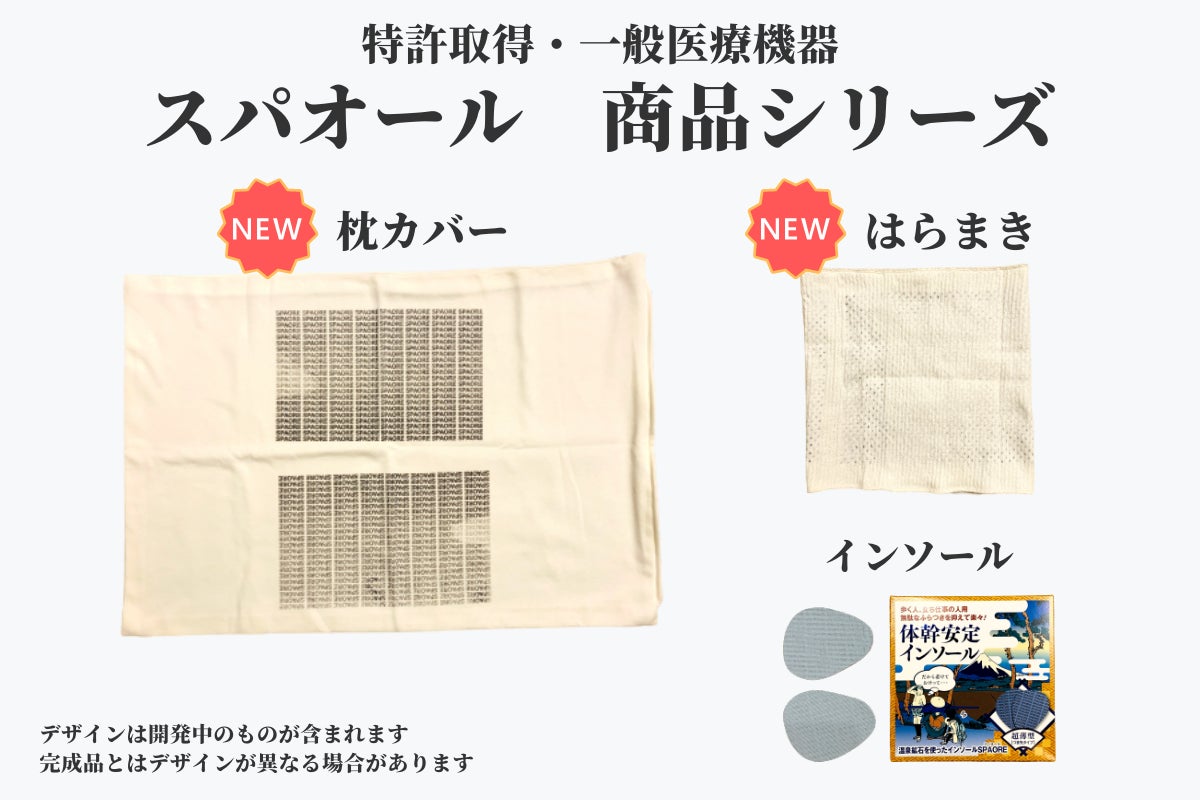 2020年12月に特許を取得したばかりのスパオールをより身近に、日常でご利用いただけるよう従来の「インソール」に加え「枕カバー」「はらまき」という二つの新商品を仕上げました。特許取得の新商品をいち早く、自信を持ってお届けいたしますので、ぜひスパオールをお試しいただければ幸いです。
