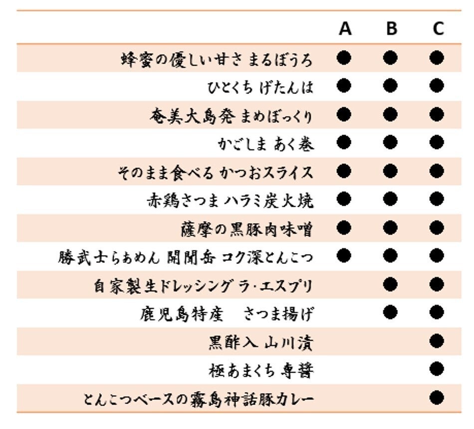 ●Aセット(8点入)・Bセット(10点入)・Cセット(13点入)の3種類あります。