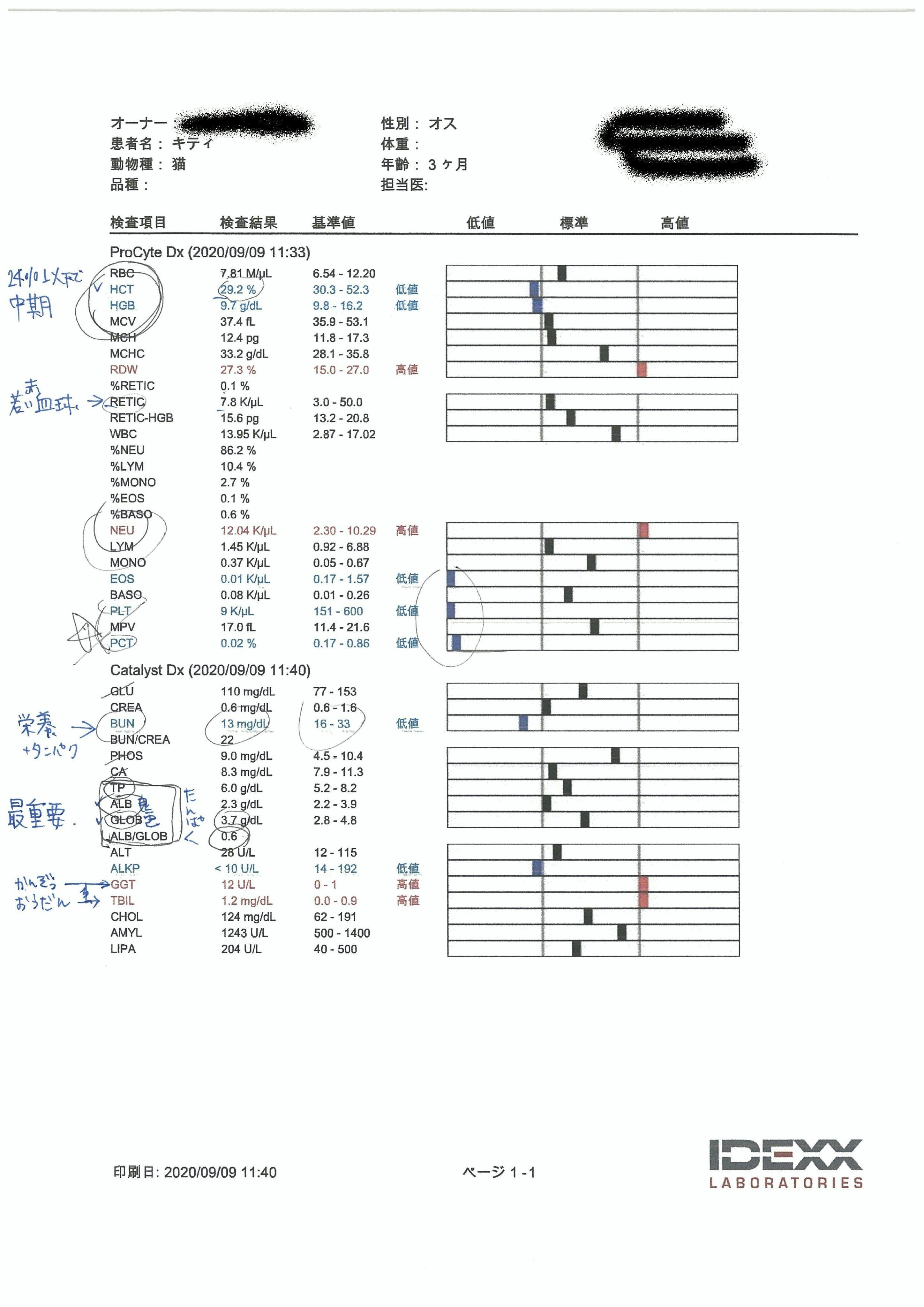 体重によって投与量は変わりますが、例えば3kgの猫ちゃんで1日300mg(=約7500円)の費用がかかります。体重増を考えなくても単純計算で63万円の投薬費が必要です。普通の会社員である私のお給料では通院検査も含め100万円近い費用の工面はかなり厳しい面がありました。悩みに悩みましたが検査結果を待つことも危ういキティのかけがいのない命にはかえられないと決心し9月9日から投薬を開始しました。