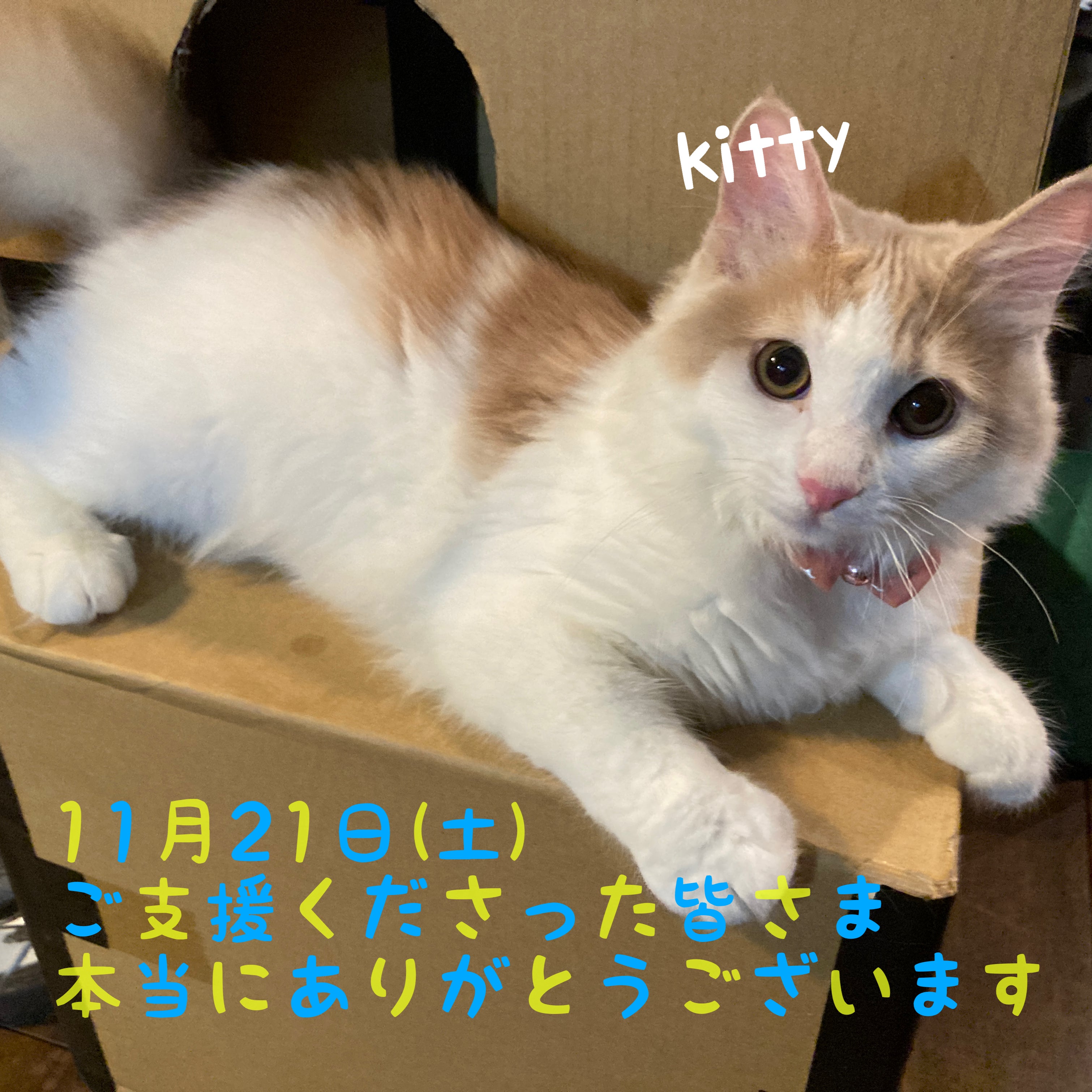 いつも温かいご支援を頂き心から感謝しています。キティはお陰様で順調に12月1日までの投薬を終え、84日間の経過観察中です。ご飯もよく食べ、よく遊び、よく寝てスクスクと成長しています。5月生まれのキティは人間でいうと小学4年生くらいなんだそうです。すっかりやんちゃな男の子!といった感じです。おチビ時代が懐かしい。。このかけがえのないを繋ぐことができたのもご支援くださった皆様のお陰様です。クラファンの達成状況としましては45%でした。本当にありがとうございます!たくさんの方々に拡散もして頂き重ねて御礼申し上げます。1月から順次お礼をお送りしてまいります。改めて経過観察も更新いたします。今年も残すところ、あとわずかとなりました。皆様どうぞ良いお年をお迎えください。nori & キティ